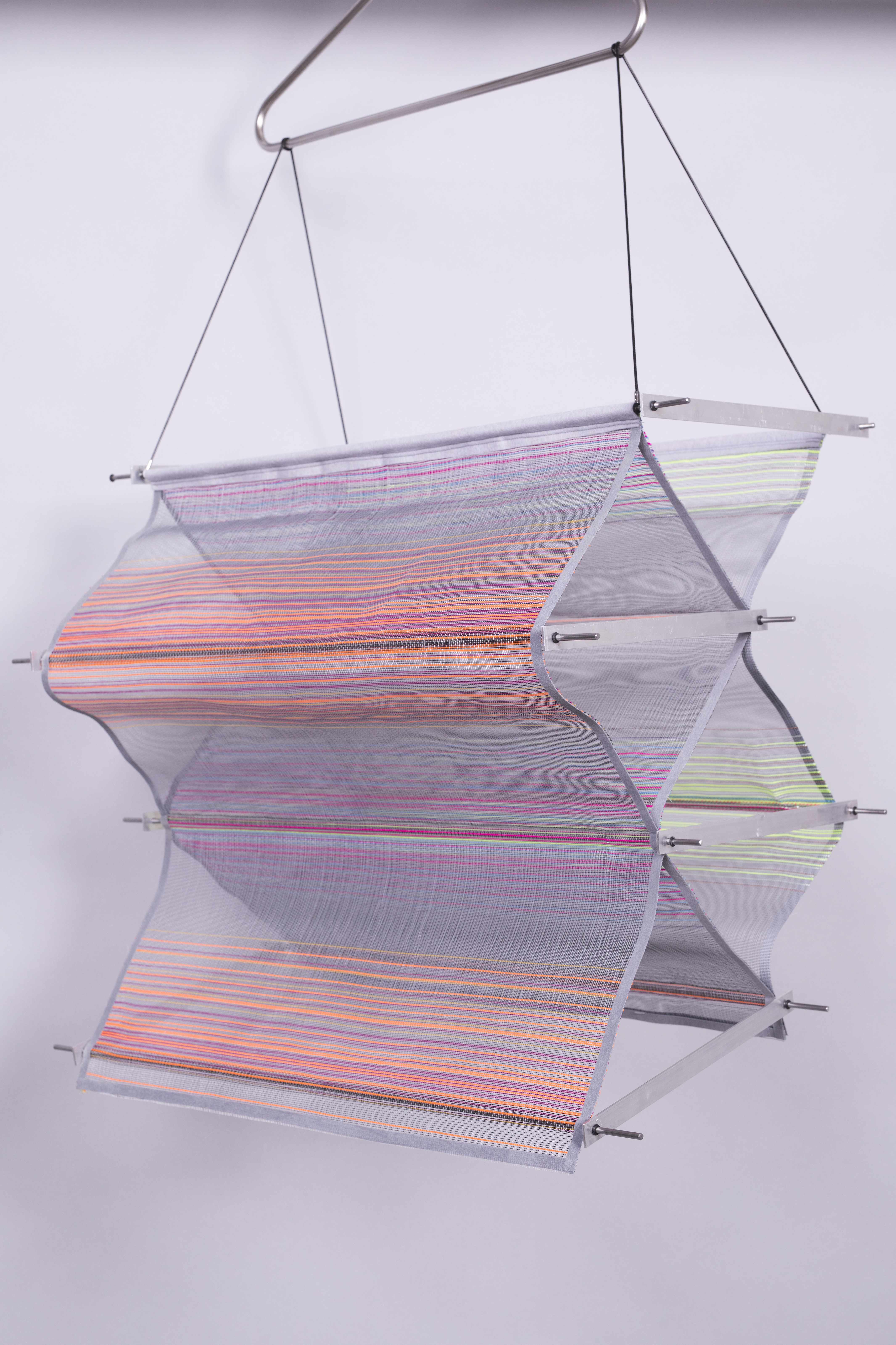Hombergen worked on a transparent monofilament warp, to be able to create a textile with multiple layers and gradients of bright colours and transparent surfaces. She created a textile that splits into several layers, so when off the loom it can be opened into a 3D structure.