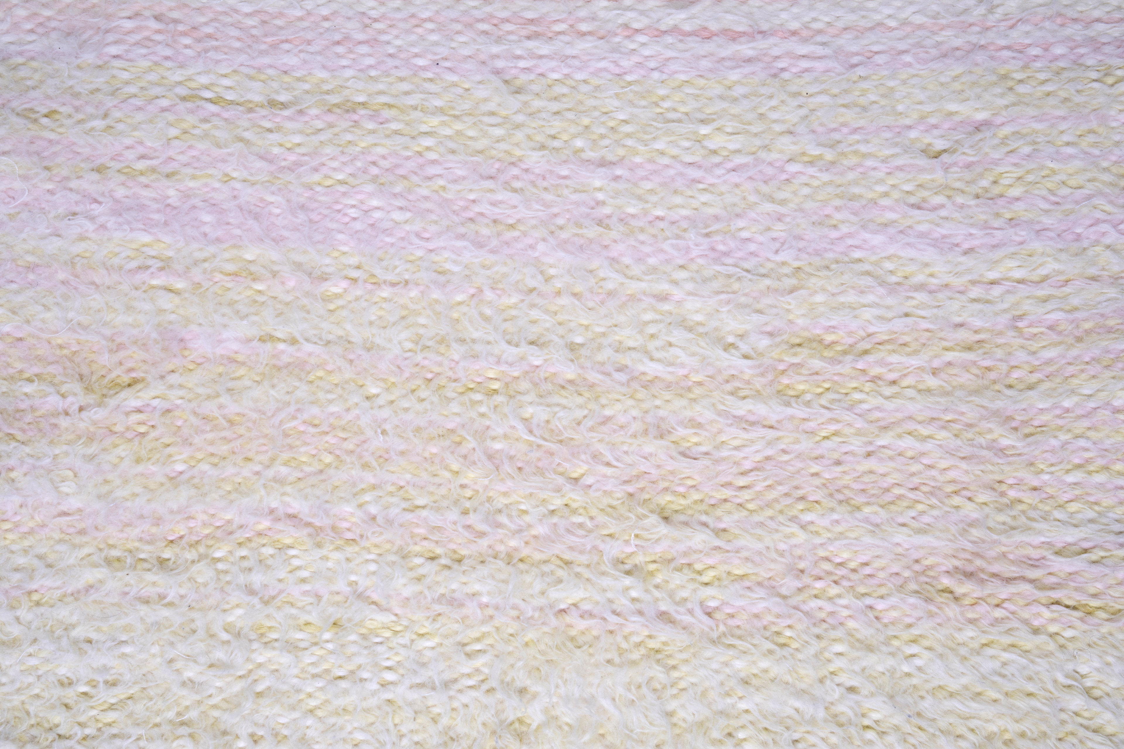 Van Kreij developed a single layered fabric with 8 different wefts. He was particularly interested in the sense of rhythm and colour in the original of Gunta Stölz and the effective use of the different weaves.