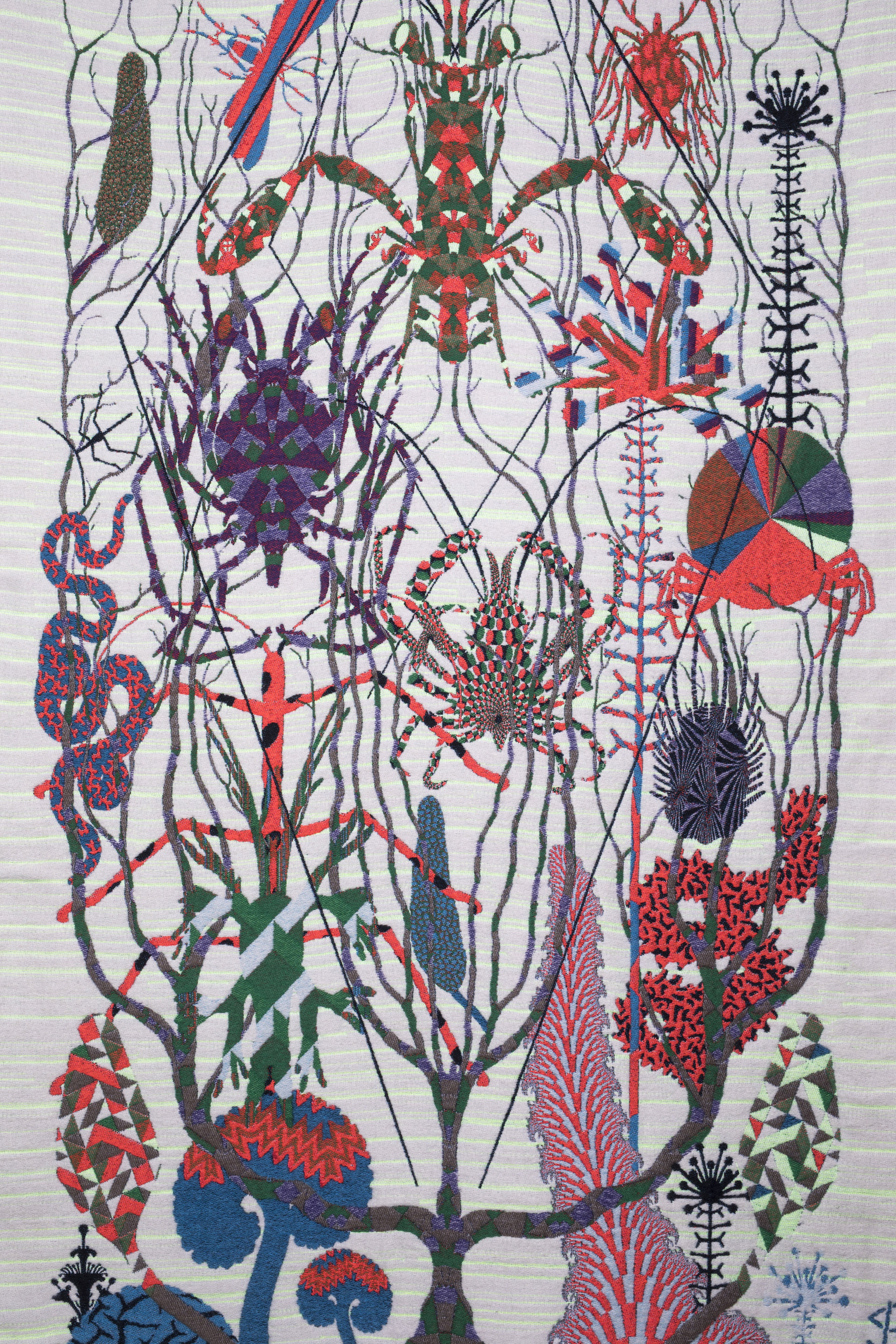 In 2005, artist Peter Struycken developed jacquard woven curtains for Kasteel Wijlre, an estate where nature, culture, contemporary art and architecture come together. Art collectors Jo and Marlies Eyck, who live in the 17th-century castle, asked Struycken to design curtains around the dining room. Struycken drew inspiration from the Gobelin Room in the Gemeentemuseum Den Haag. When the curtains are closed, they create a three-dimensional colour room.