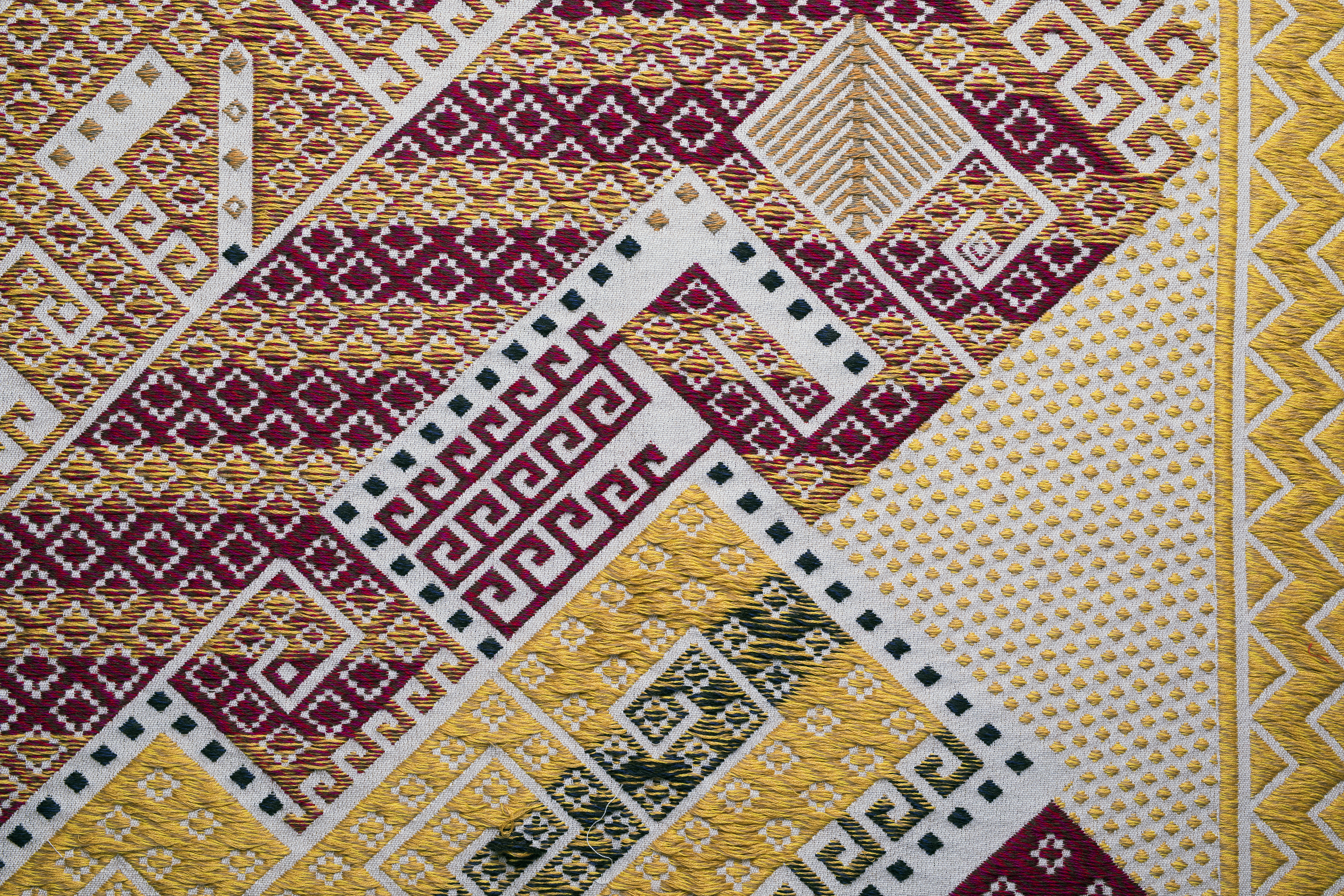 Vulsma experimented with ways to translate binary data from digitised historical documents into bindings in the weave. He also created irregularity in the weave, which can be seen, for example, in the loose weft threads.